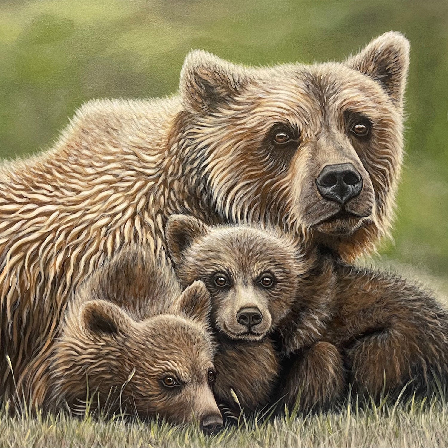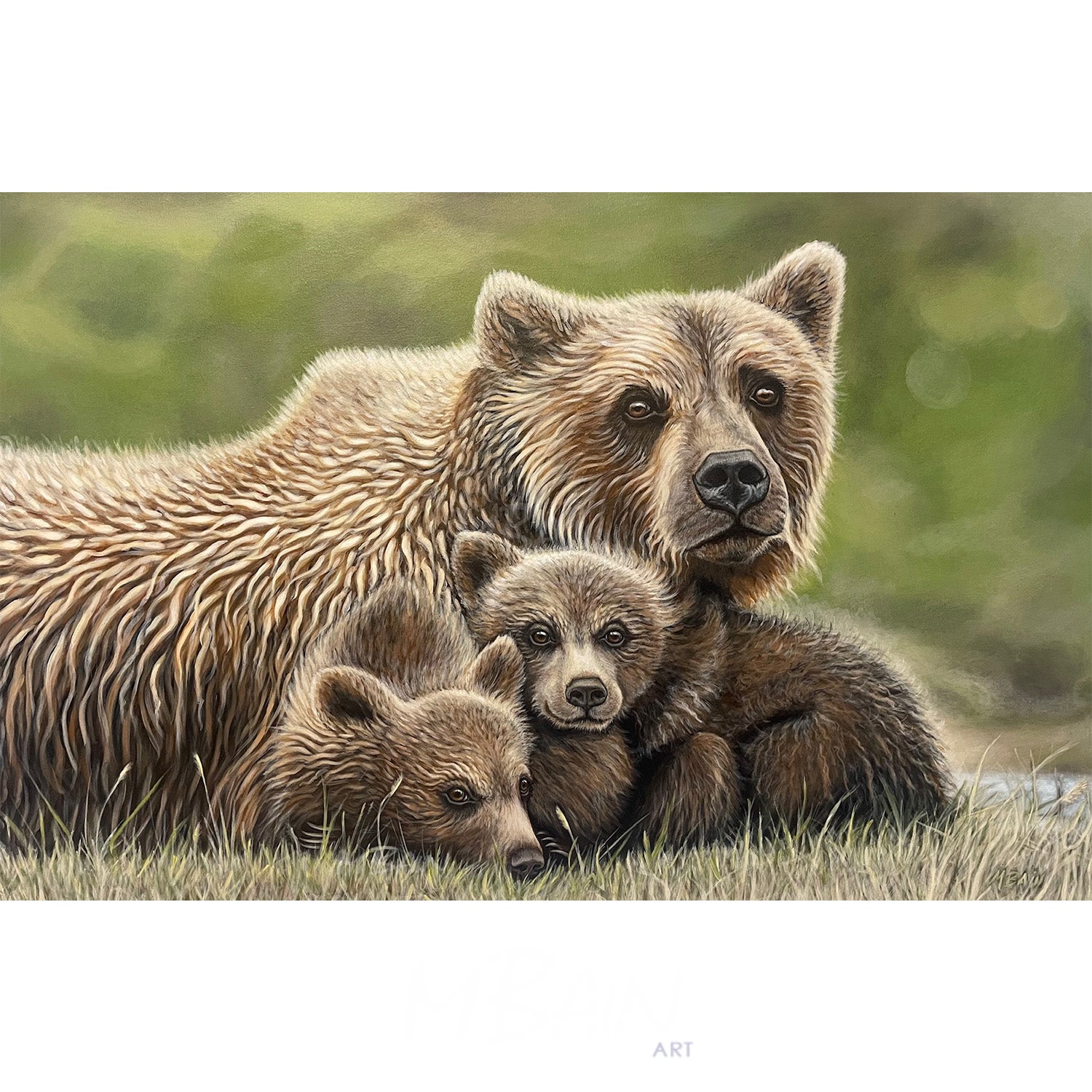 The photographic image referenced / licensed for this painting was taken by talented American wildlife photographer Andrew Sentipal; Photographers note: "That is one of my favorite images. I really liked the stacked ears. This was taken in Katmai National Park in Alaska. The only way into the particular area this was taken in is by float plane. No roads, boat access and hiking might be 40 plus miles to get there. We landed on a small pond nearby and walked to the area of the river to watch the Salmon run. The place where we were when I took the image is a small flat area above the river where the Salmon were spawning. Look hard and you will see a small portion of the river in the frame. We spent quite some time with this group. Mom was fishing and the two first year cubs played with each other on shore when we first spotted them. Then she took them up and away from the river. Mom looked exhausted. Male grizzlies will kill the cubs in order to mate so she had to keep moving them around. She felt comfortable enough with us that she fell asleep and through a long lens I was able to photograph them for quite some time. A day to remember for sure. Looking at the bear images from that shoot brings back lots of memories. It was a big honor for mom to allow us to sit on the bluff with her and eat lunch. It is so special to spend time with these amazing animals. Check out the Brooks Falls bear cams on YouTube to explore. The salmon are running and the bears are taking advantage of it." ~ Andrew Sentipal
